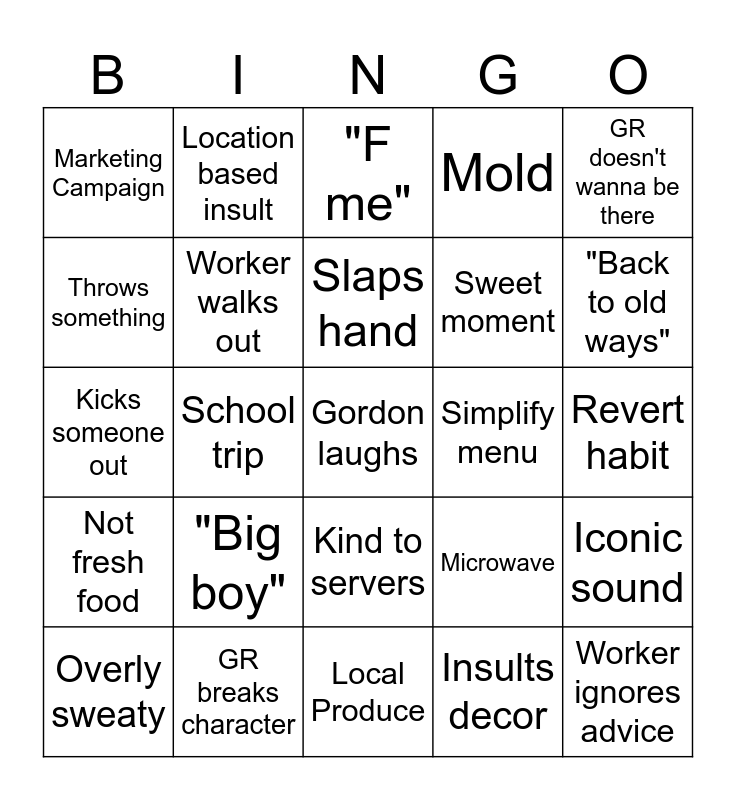 This bingo card has 25 words: "Big boy", Local Produce, Slaps hand, Overly sweaty, GR doesn't wanna be there, Marketing Campaign, Throws something, Location based insult, Simplify menu, Kind to servers, Sweet moment, Kicks someone out, Microwave, Iconic sound, Worker walks out, Worker ignores advice, Revert habit, "F me", "Back to old ways", School trip, Gordon laughs, GR breaks character, Not fresh food, Mold and Insults decor.