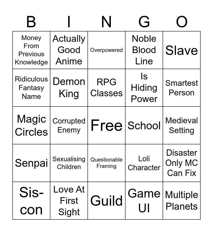 Shitty Isekai Bingo | Isekai Bingo | Bad School Fantasy Bingo | Isekai Trope Bingo | garbage isekai