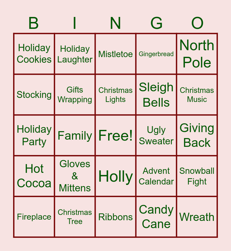 This bingo card has a free space and 59 words: Christmas Caroling, Christmas Tree, Snowflakes, Hot Cocoa, Candy Cane, Santa Hat, Gifts Wrapping, Ornament, Sleigh Bells, Winter Wonderland, Gingerbread, Jingle Bells, Stocking, Elf, Snowman, Holiday Cookies, Wreath, North Pole, Reindeer, Christmas Lights, Ugly Sweater, Mistletoe, Fireplace, Snowball Fight, Eggnog, Igloo, Holiday Spirit, Twinkling Lights, Christmas Music, Friendship, New Years, Countdown, Tree Decorating, Santa Claus, Holiday Laughter, Vacation Time, Helping Others, Family, Chestnuts, Holiday Party, Knit Hats, Gloves & Mittens, Giving Back, Snow Days, Christmas Eve, Green & Red, Secret Santa, Peppermint, Holly, Ribbons, Bow, Pinecone, Candles, December, Star, Advent Calendar, Cranberry, Popcorn and Sugar Plum.