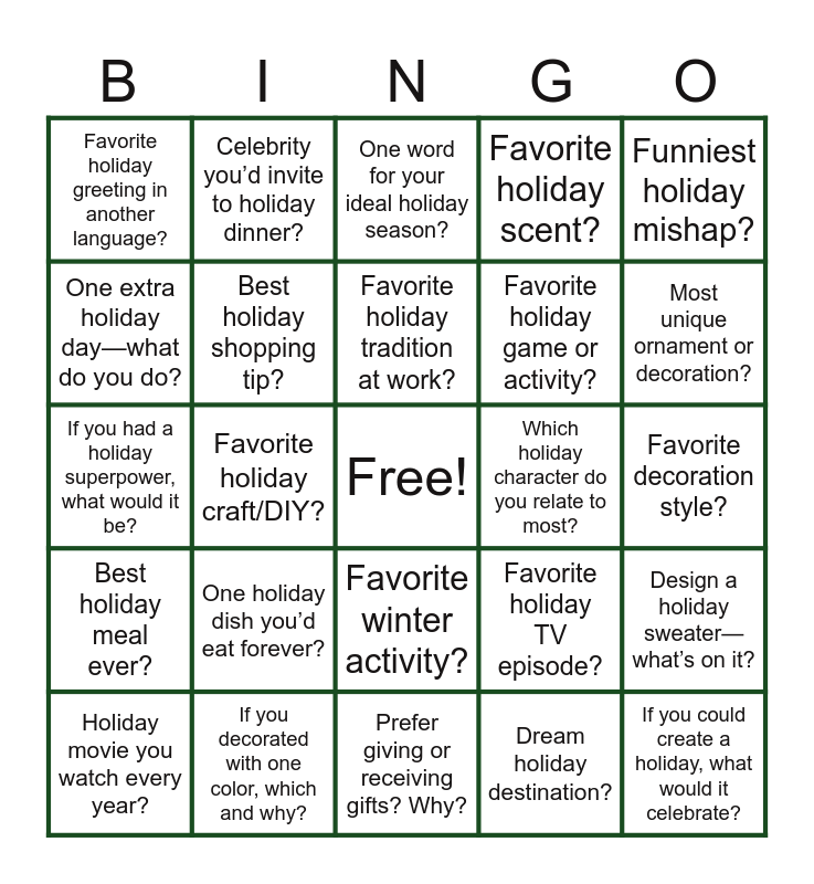 This bingo card has a free space and 44 words: Favorite holiday tradition?, If you could create a holiday, what would it celebrate?, Most memorable gift?, Holiday movie you watch every year?, Go-to festive drink or treat?, Dream holiday destination?, One word for your ideal holiday season?, Favorite holiday song?, Funniest holiday mishap?, If you decorated with one color, which and why?, Favorite holiday scent?, Which holiday character do you relate to most?, Favorite winter activity?, One holiday dish you’d eat forever?, Best holiday light display you’ve seen?, Prefer giving or receiving gifts? Why?, Favorite childhood holiday memory?, If you had a holiday superpower, what would it be?, Favorite holiday cookie or dessert?, Most unique ornament or decoration?, Celebrity you’d invite to holiday dinner?, Favorite holiday beverage?, One thing you always do to make the season special?, Favorite holiday greeting in another language?, First song you play when the season starts?, Favorite decoration style?, Strangest gift received?, Swap traditions with any country—which?, Favorite holiday TV episode?, Best holiday meal ever?, Favorite holiday drink recipe?, Design a holiday sweater—what’s on it?, Favorite holiday market/event?, Most creative gift you’ve given?, Favorite holiday craft/DIY?, Magic dessert—what appears?, Favorite childhood school holiday memory?, Funniest holiday card you’ve seen?, Favorite holiday tradition at work?, One extra holiday day—what do you do?, Favorite holiday game or activity?, Most unusual holiday food tried?, Best holiday shopping tip? and Favorite holiday charity or way to give back?.