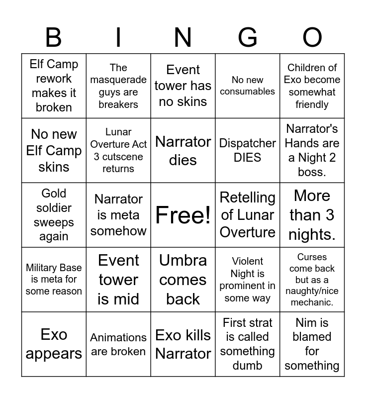 This bingo card has a free space and 24 words: Event tower is mid, Animations are broken, Narrator dies, Exo appears, Children of Exo become somewhat friendly, Elf Camp rework makes it broken, No new Elf Camp skins, The masquerade guys are breakers, Retelling of Lunar Overture, Umbra comes back, Dispatcher DIES, Gold soldier sweeps again, Violent Night is prominent in some way, Curses come back but as a naughty/nice mechanic., Lunar Overture Act 3 cutscene returns, First strat is called something dumb, More than 3 nights., Event tower has no skins, Narrator's Hands are a Night 2 boss., Narrator is meta somehow, Nim is blamed for something, Military Base is meta for some reason, No new consumables and Exo kills Narrator.