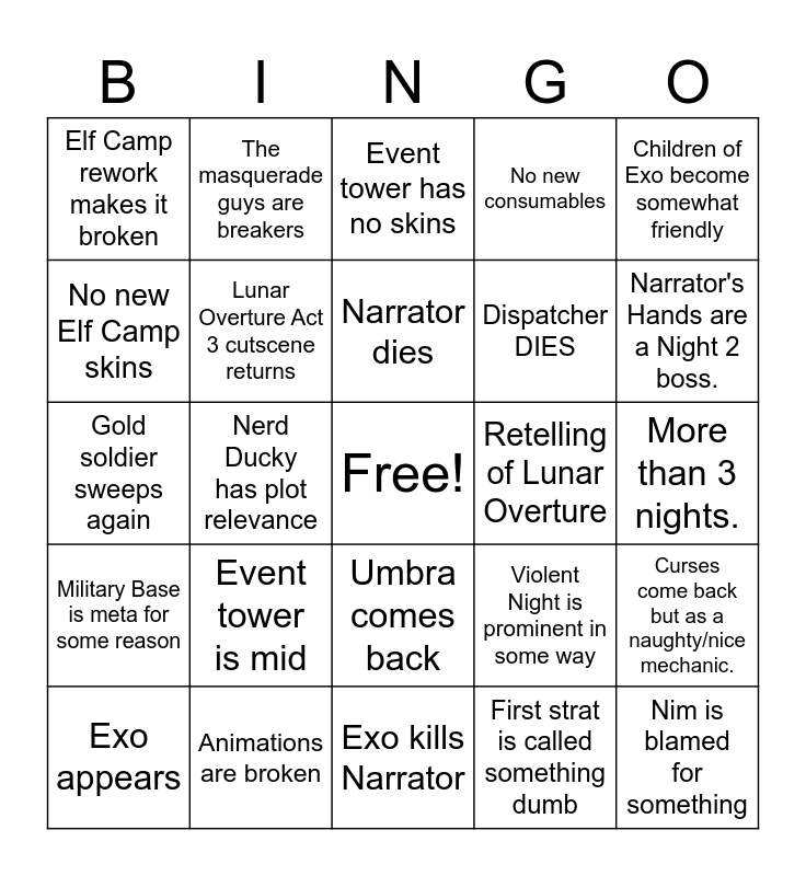 This bingo card has a free space and 24 words: Event tower is mid, Animations are broken, Narrator dies, Exo appears, Children of Exo become somewhat friendly, Elf Camp rework makes it broken, No new Elf Camp skins, The masquerade guys are breakers, Retelling of Lunar Overture, Umbra comes back, Dispatcher DIES, Gold soldier sweeps again, Violent Night is prominent in some way, Curses come back but as a naughty/nice mechanic., Lunar Overture Act 3 cutscene returns, First strat is called something dumb, More than 3 nights., Event tower has no skins, Narrator's Hands are a Night 2 boss., Nerd Ducky has plot relevance, Nim is blamed for something, Military Base is meta for some reason, No new consumables and Exo kills Narrator.