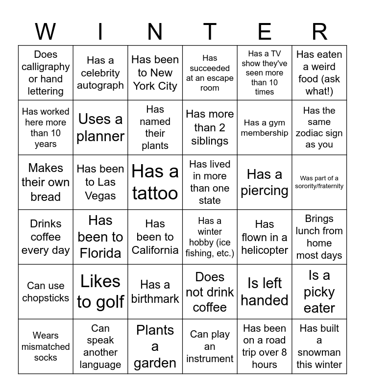 This bingo card has 60 words: Likes winter more than summer, Has a winter hobby (ice fishing, etc.), Has traveled out of the country, Has lived in more than one state, Brings lunch from home most days, Owns more than 100 books, Has worked here more than 10 years, Knows a coworkers birthday by heart, Has named their plants, Is in a book club, Has succeeded at an escape room, Has been on a cruise, Has eaten a weird food (ask what!), Wears mismatched socks, Collects something unusual, Does calligraphy or hand lettering, Makes their own bread, Has a TV show they've seen more than 10 times, Has a food allergy or unique diet, Uses a planner, Has been to Las Vegas, Has been to New York City, Has been to California, Has been to Florida, Is an only child, Can speak another language, Is left handed, Someone who went to a different school than you, Has more than 2 siblings, Can play an instrument, Never broken a bone, Middle name starts with the same letter, Is a twin or has twins in family, Named after a family member, Has a celebrity autograph, Likes to golf, Does not have Facebook, Has the same zodiac sign as you, Plants a garden, Has a gym membership, Enjoys sewing, Has a piercing, Has a tattoo, Does not drink soda, Drinks coffee every day, Does not drink coffee, Has an account on 5+ social media platforms, Was born at LCHC, Has more than 2 kids, Was part of a sorority/fraternity, Has flown in a helicopter, Was not born in Iowa, Has built a snowman this winter, Has a birthmark, Is a picky eater, Has been on a road trip over 8 hours, Has moved more than 3 times, Goes by a middle name/nickname, Can use chopsticks and Likes spicy food.