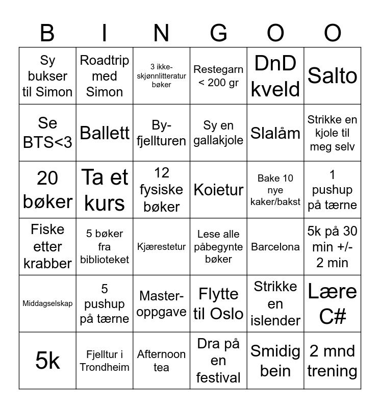 This bingo card has 36 words: Flytte til Oslo, Master-oppgave, Dra på en festival, Se BTS<3, Fiske etter krabber, Koietur, Ballett, Afternoon tea, DnD kveld, Strikke en islender, Strikke en kjole til meg selv, Restegarn < 200 gr, Lære C#, Ta et kurs, Sy en gallakjole, Sy bukser til Simon, Middagselskap, Bake 10 nye kaker/bakst, 20 bøker, 3 ikke-skjønnlitteratur bøker, 12 fysiske bøker, 5 bøker fra biblioteket, Lese alle påbegynte bøker, Kjærestetur, Barcelona, Roadtrip med Simon, Slalåm, Fjelltur i Trondheim, By-fjellturen, Salto, 2 mnd trening, 5k, 5k på 30 min +/- 2 min, 1 pushup på tærne, 5 pushup på tærne and Smidig bein.