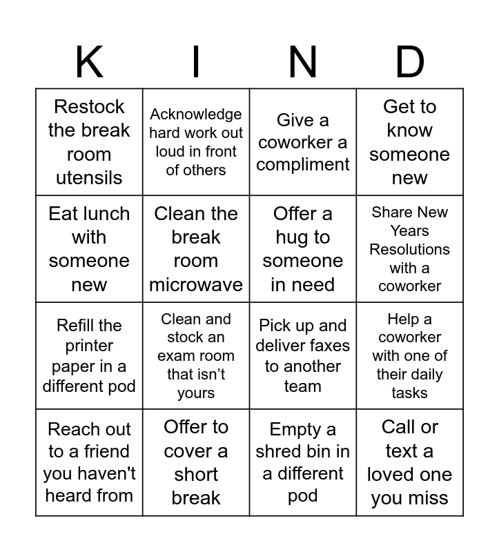 This bingo card has 24 words: Invite someone to do a Take-10 activity with you, Call an insurance for somebody else, Share New Years Resolutions with a coworker, Wash and put away dishes in the break room, Eat lunch with someone new, Restock the break room utensils, Clean the break room microwave, Acknowledge hard work out loud in front of others, Offer to cover a short break, Share a pen or office supplies with someone, Refill the printer paper in a different pod, Pick up and deliver faxes to another team, Hold the door open for a coworker, Share a snack with someone, Offer a hug to someone in need, Leave a thank you note for a colleague, Empty a shred bin in a different pod, Give a coworker a compliment, Clean and stock an exam room that isn’t yours, Help a coworker with one of their daily tasks, Reach out to a friend you haven't heard from, Call or text a loved one you miss, Get to know someone new and Fill up someone's drink cup.