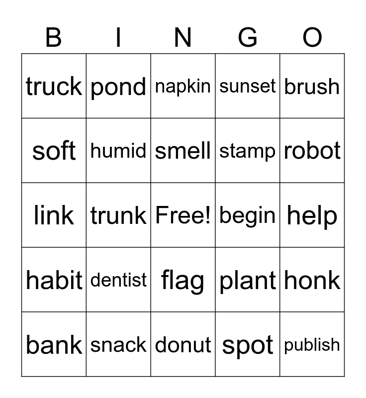 This bingo card has a free space and 26 words: flag, spot, smell, snack, brush, truck, soft, pond, help, plant, stamp, link, honk, bank, trunk, think, sunset, habit, napkin, publish, robot, donut, begin, dentist, humid and program.
