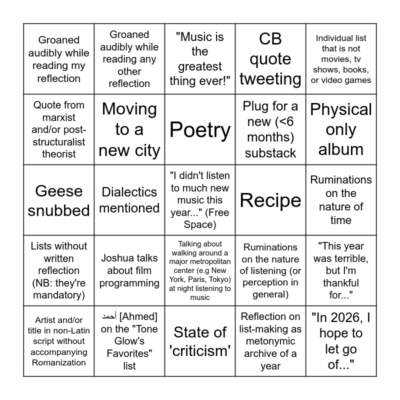 This bingo card has a free space and 24 words: Joshua talks about film programming, أحمد [Ahmed] on the "Tone Glow's Favorites" list, Poetry, Artist and/or title in non-Latin script without accompanying Romanization, Individual list that is not movies, tv shows, books, or video games, Groaned audibly while reading my reflection, Quote from marxist and/or post-structuralist theorist, Groaned audibly while reading any other reflection, Recipe, Talking about walking around a major metropolitan center (e.g New York, Paris, Tokyo) at night listening to music, Plug for a new (<6 months) substack, Geese snubbed, Ruminations on the nature of listening (or perception in general), "This year was terrible, but I'm thankful for...", Moving to a new city, Reflection on list-making as metonymic archive of a year, Ruminations on the nature of time, "Music is the greatest thing ever!", Physical only album, Dialectics mentioned, "In 2026, I hope to let go of...", Lists without written reflection (NB: they're mandatory), CB quote tweeting and State of 'criticism'.