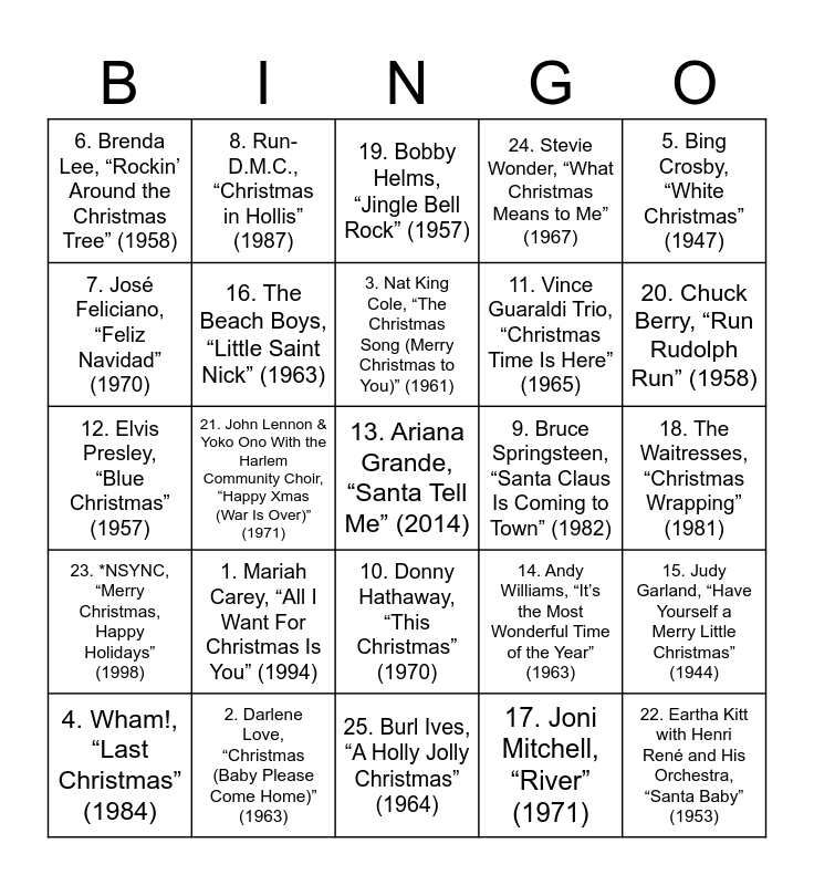 This bingo card has a free space and 24 words: 1. Mariah Carey, “All I Want For Christmas Is You” (1994), 2. Darlene Love, “Christmas (Baby Please Come Home)” (1963), 3. Nat King Cole, “The Christmas Song (Merry Christmas to You)” (1961), 4. Wham!, “Last Christmas” (1984), 5. Bing Crosby, “White Christmas” (1947), 6. Brenda Lee, “Rockin’ Around the Christmas Tree” (1958), 7. José Feliciano, “Feliz Navidad” (1970), 8. Run-D.M.C., “Christmas in Hollis” (1987), 9. Bruce Springsteen, “Santa Claus Is Coming to Town” (1982), 10. Donny Hathaway, “This Christmas” (1970), 11. Vince Guaraldi Trio, “Christmas Time Is Here” (1965), 12. Elvis Presley, “Blue Christmas” (1957), 14. Andy Williams, “It’s the Most Wonderful Time of the Year” (1963), 15. Judy Garland, “Have Yourself a Merry Little Christmas” (1944), 16. The Beach Boys, “Little Saint Nick” (1963), 17. Joni Mitchell, “River” (1971), 18. The Waitresses, “Christmas Wrapping” (1981), 19. Bobby Helms, “Jingle Bell Rock” (1957), 20. Chuck Berry, “Run Rudolph Run” (1958), 21. John Lennon & Yoko Ono With the Harlem Community Choir, “Happy Xmas (War Is Over)” (1971), 22. Eartha Kitt with Henri René and His Orchestra, “Santa Baby” (1953), 23. *NSYNC, “Merry Christmas, Happy Holidays” (1998), 24. Stevie Wonder, “What Christmas Means to Me” (1967) and 25. Burl Ives, “A Holly Jolly Christmas” (1964).