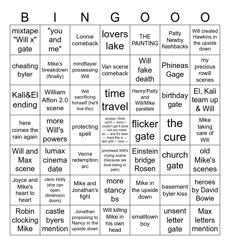This bingo card has a free space and 48 words: Mike in the upside down, Phineas Gage, Will killing Mike in his own head, more Will's powers, Will sacrificing himself (he'll live tho), Mike taking care of Will, "you and me", castle byers mention, Patty Newby flashbacks, promised Will's crying scene (because we love being in pain), Will created Hawkins in the upside down, lovers lake, birthday gate, Henry/Patty and Will/Mike parallels, Joyce and Mike's heart to heart, the cure, cheating byler, my precious rowill scenes, basement byler kiss, THE PAINTING, Will fake death, protecting spell, mixtape "Will x" gate, Mike's breakdown (finally), heroes by David Bowie, mindflayer possessing Will, El, Kali team up & Will, Robin clocking Mike, time travel, William Afton 2.0 scene, unsent letter gate, flicker gate, old Mike's scenes, cleric Holly (she can open dimension doors), here comes the rain again, Einstein bridge Rosen, church gate, Kali&El ending, Vecna redemption arc, Mike and Jonathan's fight, Will and Max scene, Max letters mention, Lonnie comeback, Jonathan proposing to Nancy in the upside down, Van scene comeback, more stancy bs, lumax cinema date and smalltown boy.