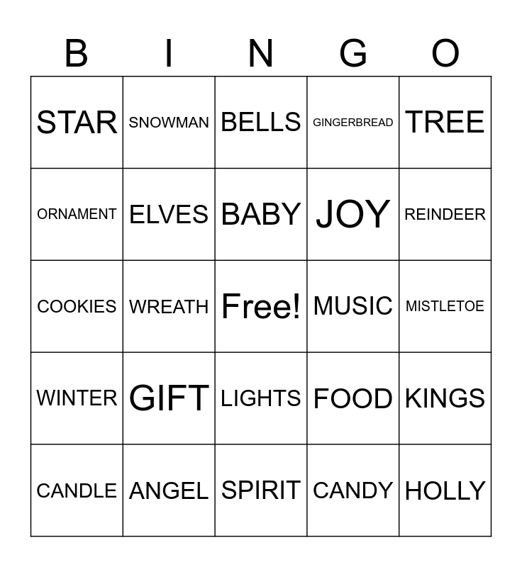This bingo card has a free space and 24 words: GIFT, ANGEL, BABY, CANDLE, TREE, STAR, ORNAMENT, SNOWMAN, MUSIC, LIGHTS, JOY, COOKIES, FOOD, KINGS, ELVES, CANDY, MISTLETOE, BELLS, REINDEER, WREATH, HOLLY, WINTER, GINGERBREAD and SPIRIT.