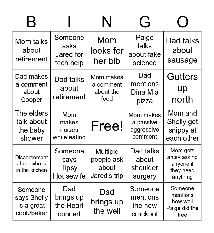 This bingo card has a free space and 24 words: Someone says Tipsy Housewife, Dad brings up the Heart concert, Mom makes a comment about the food, Someone says Shelly is a great cook/baker, Dad talks about sausage, Mom talks about retirement, Dad makes a comment about Cooper, Someone asks Jared for tech help, Mom makes a passive aggressive comment, Multiple people ask about Jared's trip, Dad mentions Dina Mia pizza, The elders talk about the baby shower, Dad talks about shoulder surgery, Mom gets antsy asking anyone if they need anything, Dad talks about retirement, Someone mentions the new crockpot, Mom and Shelly get snippy at each other, Mom looks for her bib, Gutters up north, Mom makes noises while eating, Someone mentions how well Paige did the tree, Disagreement about who is in the kitchen, Paige talks about fake science and Dad brings up the well.