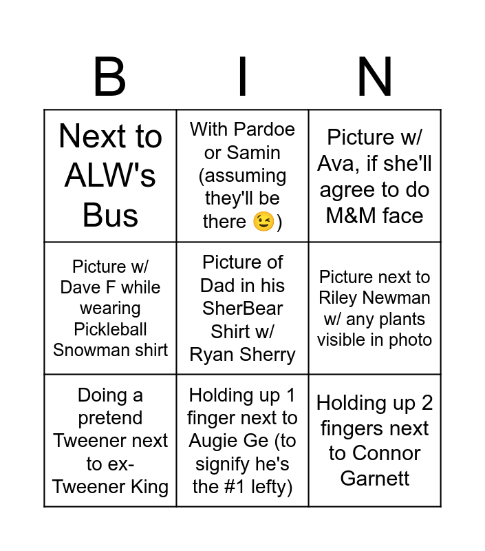 This bingo card has 9 words: Doing a pretend Tweener next to ex-Tweener King, Picture w/ Ava, if she'll agree to do M&M face, With Pardoe or Samin (assuming they'll be there 😉), Picture w/ Dave F while wearing Pickleball Snowman shirt, Next to ALW's Bus, Picture next to Riley Newman w/ any plants visible in photo, Picture of Dad in his SherBear Shirt w/ Ryan Sherry, Holding up 2 fingers next to Connor Garnett and Holding up 1 finger next to Augie Ge (to signify he's the #1 lefty).