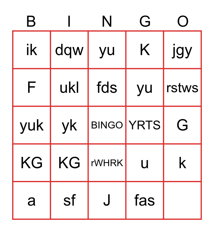 This bingo card has a free space and 26 words: a, sf, fds, fas, jgy, ik, ukl, yu, yu, k, yuk, yk, yf, u, rstws, e, dqw, rWHRK, K, G, KG, KG, J, YRTS, F and GE.