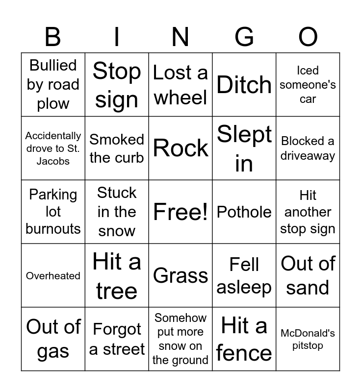 This bingo card has a free space and 24 words: Hit a tree, Forgot a street, Rock, Out of gas, Iced someone's car, Bullied by road plow, Accidentally drove to St. Jacobs, Stop sign, Pothole, Grass, Slept in, Parking lot burnouts, Fell asleep, Out of sand, Smoked the curb, Hit a fence, Hit another stop sign, Lost a wheel, Blocked a driveaway, Stuck in the snow, McDonald's pitstop, Overheated, Ditch and Somehow put more snow on the ground.