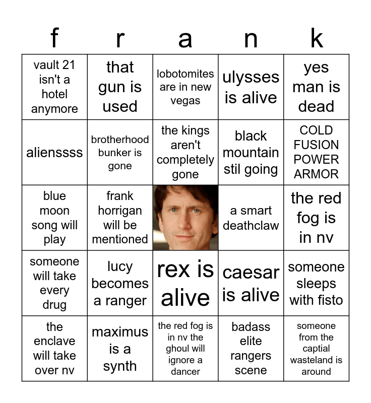 This bingo card has a free space and 24 words: lucy becomes a ranger, maximus is a synth, the kings aren't completely gone, the enclave will take over nv, yes man is dead, vault 21 isn't a hotel anymore, alienssss, that gun is used, a smart deathclaw, rex is alive, black mountain stil going, blue moon song will play, caesar is alive, someone sleeps with fisto, brotherhood bunker is gone, badass elite rangers scene, the red fog is in nv, lobotomites are in new vegas, COLD FUSION POWER ARMOR, frank horrigan will be mentioned, someone from the captial wasteland is around, someone will take every drug, ulysses is alive and the red fog is in nv the ghoul will ignore a dancer.
