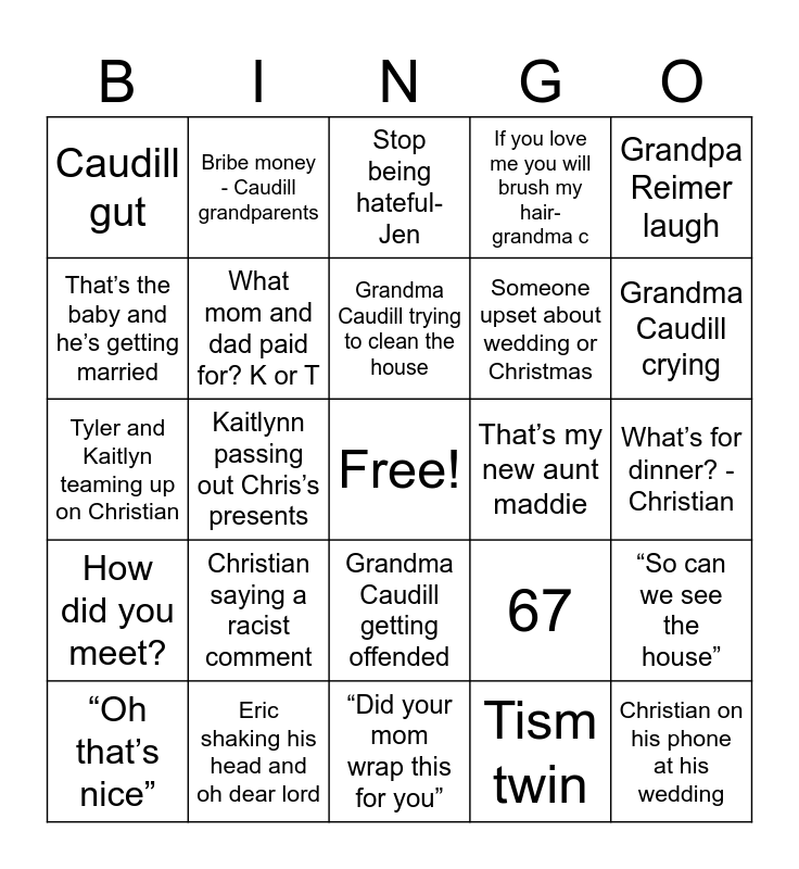 This bingo card has a free space and 24 words: Christian saying a racist comment, Eric shaking his head and oh dear lord, Grandma Caudill trying to clean the house, “Oh that’s nice”, Grandpa Reimer laugh, Caudill gut, That’s the baby and he’s getting married, Bribe money - Caudill grandparents, That’s my new aunt maddie, Grandma Caudill getting offended, Someone upset about wedding or Christmas, Tyler and Kaitlyn teaming up on Christian, 67, “So can we see the house”, What mom and dad paid for? K or T, Tism twin, What’s for dinner? - Christian, Stop being hateful- Jen, Grandma Caudill crying, Kaitlynn passing out Chris’s presents, Christian on his phone at his wedding, How did you meet?, If you love me you will brush my hair- grandma c and “Did your mom wrap this for you”.