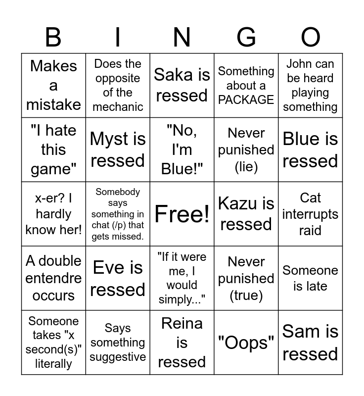This bingo card has a free space and 26 words: "If it were me, I would simply...", "Oops", "No, I'm Blue!", Says something suggestive, John can be heard playing something, Makes a mistake, "I hate this game", Does the opposite of the mechanic, Cat interrupts raid, Never punished (true), Never punished (lie), x-er? I hardly know her!, Someone is late, Someone takes "x second(s)" literally, Somebody says something in chat (/p) that gets missed., The intrusive thoughts win, Something about a PACKAGE, A double entendre occurs, Saka is ressed, Sam is ressed, Blue is ressed, Reina is ressed, Kazu is ressed, Eve is ressed, Myst is ressed and Taco is ressed.