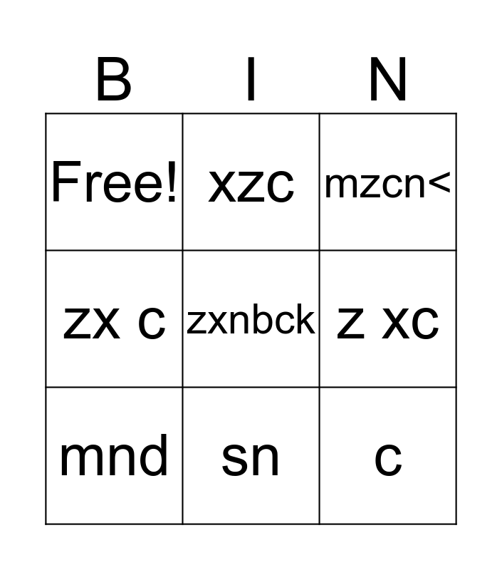 This bingo card has 9 words: mnd, mzcn<, xzc, zx c, Free!, z xc, zxnbck, c and sn.