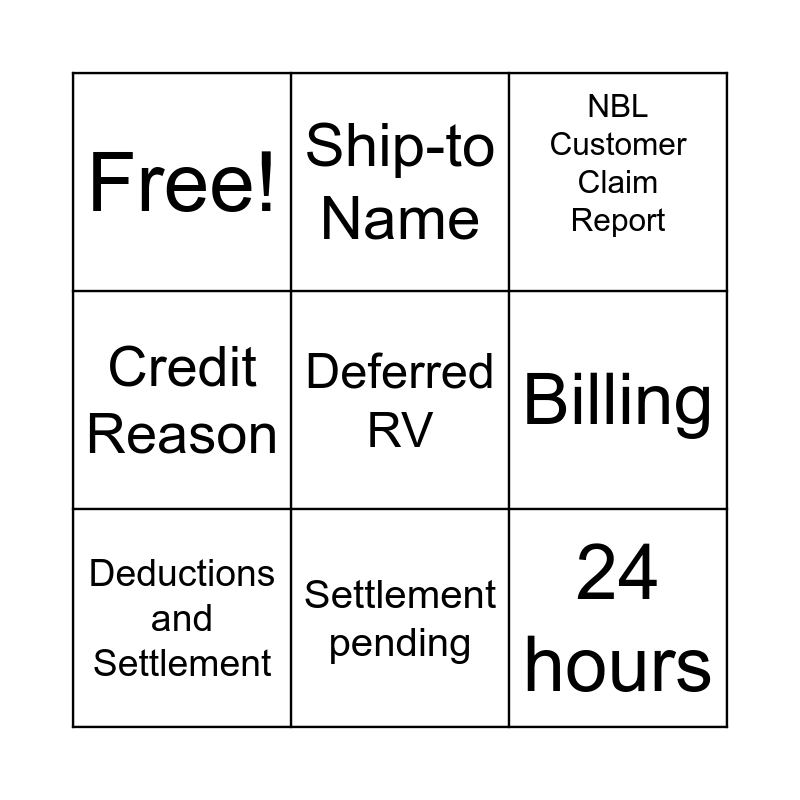 This bingo card has 9 words: Deductions and Settlement, NBL Customer Claim Report, Ship-to Name, Credit Reason, Free!, Billing, Deferred RV, 24 hours and Settlement pending.