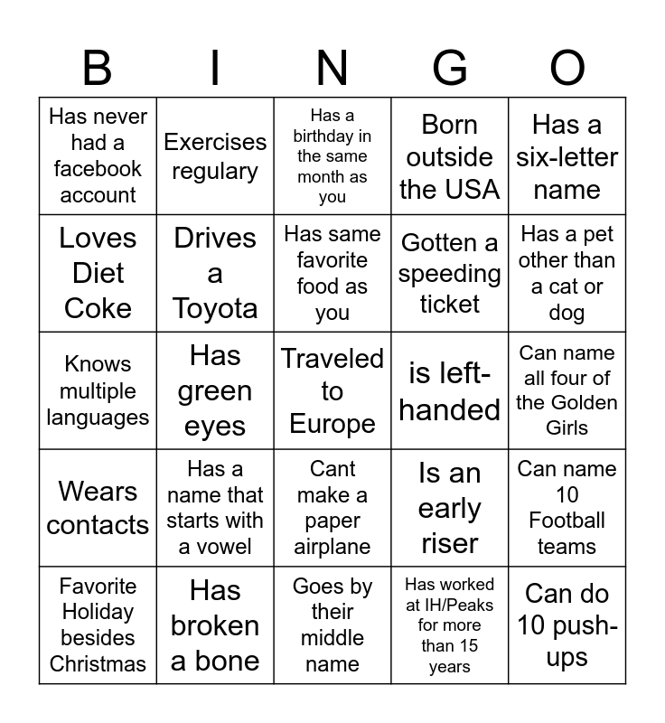 This bingo card has 30 words: Has broken a bone, Owns a side business, Has green eyes, had/has braces, Has never had a facebook account, Has a birthday in the same month as you, Drives a Toyota, Cant make a paper airplane, is left-handed, Goes by their middle name, Can name all four of the Golden Girls, Traveled to Europe, Has worked at IH/Peaks for more than 15 years, Can do 10 push-ups, Has a pet other than a cat or dog, Believes in Bigfoot, Is an early riser, Wears contacts, Has a name that starts with a vowel, Has a six-letter name, Knows multiple languages, Empty Nesters, Exercises regulary, Gotten a speeding ticket, Loves Diet Coke, Born outside the USA, Can name 10 Football teams, Favorite Holiday besides Christmas, Has same favorite food as you and Has same favorite restaurant as you.