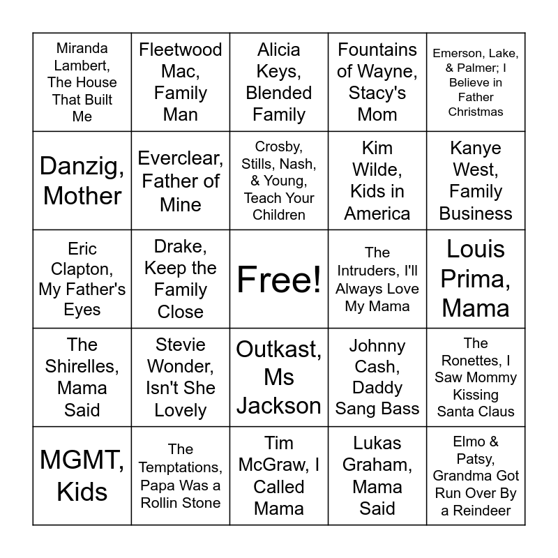 This bingo card has a free space and 75 words: 2Pac, Dear Mama, ABBA, Mamma Mia, Alicia Keys, Blended Family, Avicii, Hey Brother, Bill Withers, Grandma's Hands, blink-182, Stay Together for the Kids, Bob Carlile, Butterfly Kisses, Boyz II Men, A Song for Mama, Cat Stevens, Father and Son, CCR, Fortunate Son, Cheap Trick, Surrender, Creed, With Arms Wide Open, Crosby, Stills, Nash, & Young, Teach Your Children, Danzig, Mother, DJ Jazzy Jeff & The Fresh Prince, Parents Just Don't Understand, Drake, Keep the Family Close, Dusty Springfield, Son of a Preacher Man, Elmo & Patsy, Grandma Got Run Over By a Reindeer, Elvis Presley, Mama Liked the Roses, Emerson, Lake, & Palmer; I Believe in Father Christmas, Eminem, Mockingbird, Eric Clapton, My Father's Eyes, Everclear, Father of Mine, Fleetwood Mac, Family Man, Fountains of Wayne, Stacy's Mom, Frank Zappa, Uncle Remus, George Michael, Father Figure, Hank Williams Jr., Family Tradition, Harry Chapin, Cats in the Cradle, James Brown, Papa's Got a Brand New Bag, Jessica Andrews, Who I Am, Jessica Darrow, Surface Pressure, John Mayer, Daughters, Johnny Cash, Daddy Sang Bass, Kanye West, Family Business, Kim Wilde, Kids in America, LL COOL J, Mama Said Knock You Out, Loudon Wainwright III, White Winos, Louis Prima, Mama, Lukas Graham, Mama Said, Luther Vandross, Dance With My Father, Madonna, Papa Don't Preach, Martina McBride, In My Daughter's Eyes, Mary J Blige, Family Affair, Meghan Trainor, Mother, Merle Haggard, Mama Tried, MGMT, Kids, Miranda Lambert, The House That Built Me, My Chemical Romance, Mama, Nick Cave & The Bad Seeds, O Children, Night Ranger, Sister Christian, Outkast, Ms Jackson, Paul Simon, Father and Daughter, Perry Como, Papa Loves Mambo, Phil Collins, Son of Man, Radical Face, Sister, Simple Plan, Perfect, Sister Sledge, We Are Family, Sly and the Family Stone, Family Affair, Smashing Pumpkins, Disarm, Stevie Wonder, Isn't She Lovely, Stormzy, Brotherhood, Taylor Swift, Never Grow Up, The Beatles, Julia, The Front Bottoms, Father, The Intruders, I'll Always Love My Mama, The Lonely Island, Motherlover, The Monkees, Papa Gene's Blues, The Offspring, The Kids Aren't Alright, The Ronettes, I Saw Mommy Kissing Santa Claus, The Shirelles, Mama Said, The Temptations, Papa Was a Rollin Stone, The Who, The Kids Are Alright, Tim McGraw, I Called Mama and Vampire Weekend, Cousins.