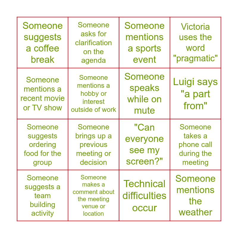 This bingo card has 16 words: Someone makes a comment about the meeting venue or location, Someone takes a phone call during the meeting, Someone mentions a sports event, Someone suggests a coffee break, Someone suggests ordering food for the group, Someone asks for clarification on the agenda, "Can everyone see my screen?", Technical difficulties occur, Someone mentions a recent movie or TV show, Someone mentions a hobby or interest outside of work, Someone suggests a team building activity, Victoria uses the word "pragmatic", Someone brings up a previous meeting or decision, Luigi says "a part from", Someone speaks while on mute and Someone mentions the weather.