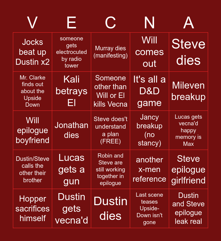 This bingo card has a free space and 39 words: Henry childhood flashback, Max or Holly dies, Lumax movie date, Kali betrays El, Hopper sacrifices himself, Robin and Steve are still working together in epilogue, Someone other than Will or El kills Vecna, A female character gets fridged, Steve dies, Dustin/Steve calls the other their brother, Jonathan dies, Will comes out, Dustin and Steve epilogue leak real, Lucas gets vecna'd happy memory is Max, Jancy breakup (no stancy), Lucas gets a gun, Demobats return, Jocks beat up Dustin x2, Will or El dies, another x-men reference, Mr. Clarke finds out about the Upside Down, Dustin dies, It's all a D&D game, Mileven breakup, Byler canon, They read Max's letters, Proposal attempt, Will loses an eye, Mike loses an arm, someone gets electrocuted by radio tower, No mains die, Ted Wheeler dies (manifesting), Murray dies (manifesting), Dustin gets vecna'd, Last scene teases Upside-Down isn't gone, Jancy epilogue wedding, Steve epilogue girlfriend, Will epilogue boyfriend and Bi Steve canon.