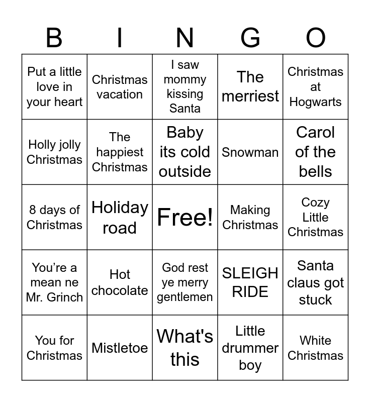 This bingo card has a free space and 50 words: Let it go, White Christmas, Grandma got run over by a reindeer, What's this, Hot chocolate, Jingle bells, Christmas vacation, Hey Santa clause, Holly jolly Christmas, Frosty the snowman, The happiest Christmas, The merriest, Santa claus got stuck, SLEIGH RIDE, Winter wonderland/ sleigh ride, Have yourself a merry little Christmas, Baby its cold outside, Making Christmas, Here it is Christmastime, Christmas at Hogwarts, Holiday road, Little drummer boy, Put a little love in your heart, Snowman, Santa coming for us, Christmas tree farm, Carol of the bells, Surfin santa, I saw mommy kissing Santa, God rest ye merry gentlemen, The chipmunk song, Feliz Navidad, Winter wonderland / don't worry be happy, Like its Christmas, Mistletoe, All I want for Christmas, Silver Bells, Santa Baby, Bring Me Love, Cozy Little Christmas, Never Do a Tango with an eskimo, Pennies from heaven, Too fat for the chimney, Santa jenny 8675309, You for Christmas, 8 days of Christmas, Counting down the days, Take me home for Christmas, You’re a mean ne Mr. Grinch and Christmas rappin.