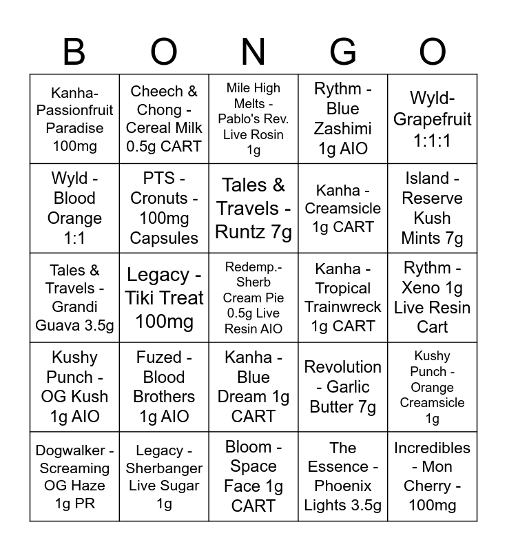 This bingo card has 25 words: Fuzed - Blood Brothers 1g AIO, Bloom - Space Face 1g CART, Tales & Travels - Runtz 7g, Dogwalker - Screaming OG Haze 1g PR, Wyld- Grapefruit 1:1:1, Kanha- Passionfruit Paradise 100mg, Wyld - Blood Orange 1:1, Cheech & Chong - Cereal Milk 0.5g CART, Kanha - Tropical Trainwreck 1g CART, Kanha - Blue Dream 1g CART, Kanha - Creamsicle 1g CART, Tales & Travels - Grandi Guava 3.5g, Revolution - Garlic Butter 7g, Kushy Punch - Orange Creamsicle 1g, PTS - Cronuts - 100mg Capsules, Incredibles - Mon Cherry - 100mg, Rythm - Xeno 1g Live Resin Cart, Mile High Melts - Pablo's Rev. Live Rosin 1g, Island - Reserve Kush Mints 7g, Legacy - Tiki Treat 100mg, Redemp.- Sherb Cream Pie 0.5g Live Resin AIO, Legacy - Sherbanger Live Sugar 1g, Kushy Punch - OG Kush 1g AIO, Rythm - Blue Zashimi 1g AIO and The Essence - Phoenix Lights 3.5g.