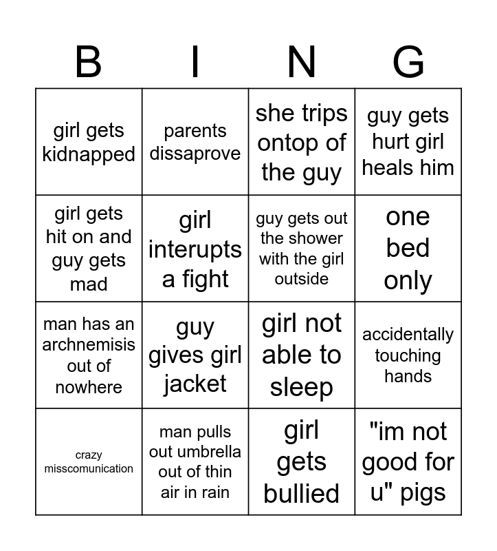 This bingo card has 16 words: man pulls out umbrella out of thin air in rain, accidentally touching hands, she trips ontop of the guy, girl gets kidnapped, man has an archnemisis out of nowhere, parents dissaprove, girl not able to sleep, girl gets bullied, girl gets hit on and guy gets mad, girl interupts a fight, crazy misscomunication, guy gets hurt girl heals him, guy gives girl jacket, one bed only, guy gets out the shower with the girl outside and "im not good for u" pigs.