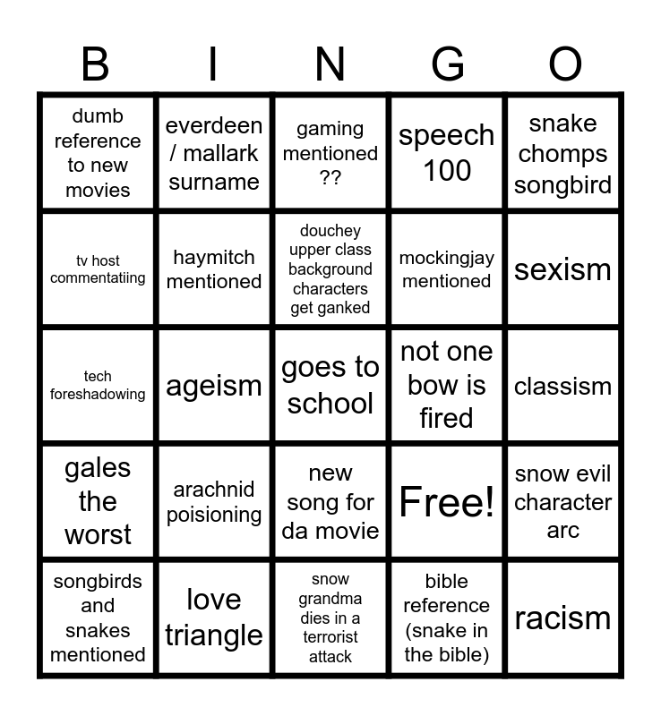 This bingo card has 25 words: arachnid poisioning, snow grandma dies in a terrorist attack, douchey upper class background characters get ganked, songbirds and snakes mentioned, snake chomps songbird, dumb reference to new movies, tv host commentatiing, everdeen / mallark surname, not one bow is fired, new song for da movie, mockingjay mentioned, tech foreshadowing, Free!, snow evil character arc, haymitch mentioned, racism, classism, gaming mentioned ??, sexism, ageism, goes to school, love triangle, gales the worst, speech 100 and bible reference (snake in the bible).