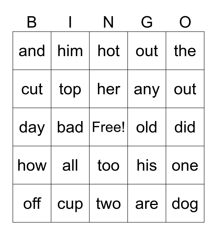 This bingo card has a free space and 24 words: all, cup, her, off, the, and, cut, him, old, too, any, day, his, one, top, are, did, hot, out, bad, dog, how, out and two.