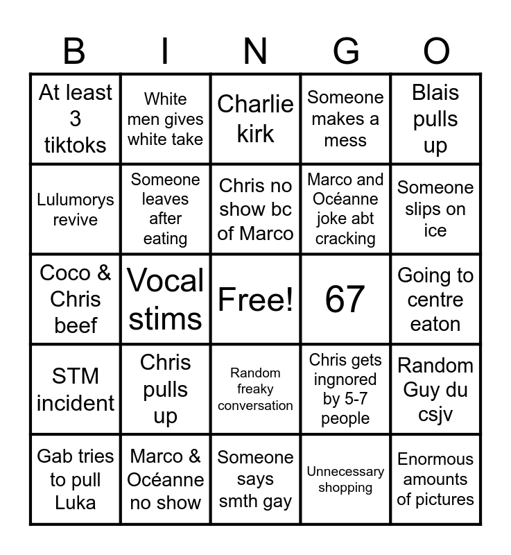 This bingo card has a free space and 24 words: Chris pulls up, Marco & Océanne no show, Chris no show bc of Marco, Gab tries to pull Luka, Blais pulls up, At least 3 tiktoks, Lulumorys revive, White men gives white take, 67, Random freaky conversation, Marco and Océanne joke abt cracking, Coco & Chris beef, Chris gets ingnored by 5-7 people, Random Guy du csjv, Someone leaves after eating, Unnecessary shopping, Going to centre eaton, Charlie kirk, Someone slips on ice, Vocal stims, Enormous amounts of pictures, STM incident, Someone makes a mess and Someone says smth gay.
