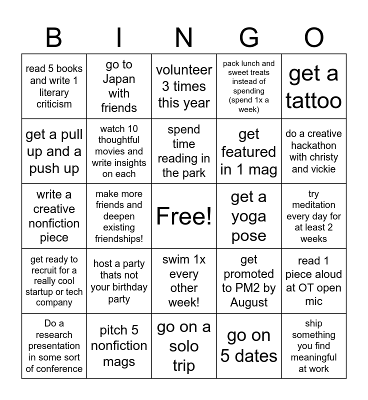 This bingo card has a free space and 24 words: host a party thats not your birthday party, pitch 5 nonfiction mags, spend time reading in the park, Do a research presentation in some sort of conference, get a tattoo, read 5 books and write 1 literary criticism, get a pull up and a push up, go to Japan with friends, get a yoga pose, swim 1x every other week!, get featured in 1 mag, write a creative nonfiction piece, get promoted to PM2 by August, read 1 piece aloud at OT open mic, watch 10 thoughtful movies and write insights on each, go on 5 dates, try meditation every day for at least 2 weeks, volunteer 3 times this year, do a creative hackathon with christy and vickie, make more friends and deepen existing friendships!, ship something you find meaningful at work, get ready to recruit for a really cool startup or tech company, pack lunch and sweet treats instead of spending (spend 1x a week) and go on a solo trip.