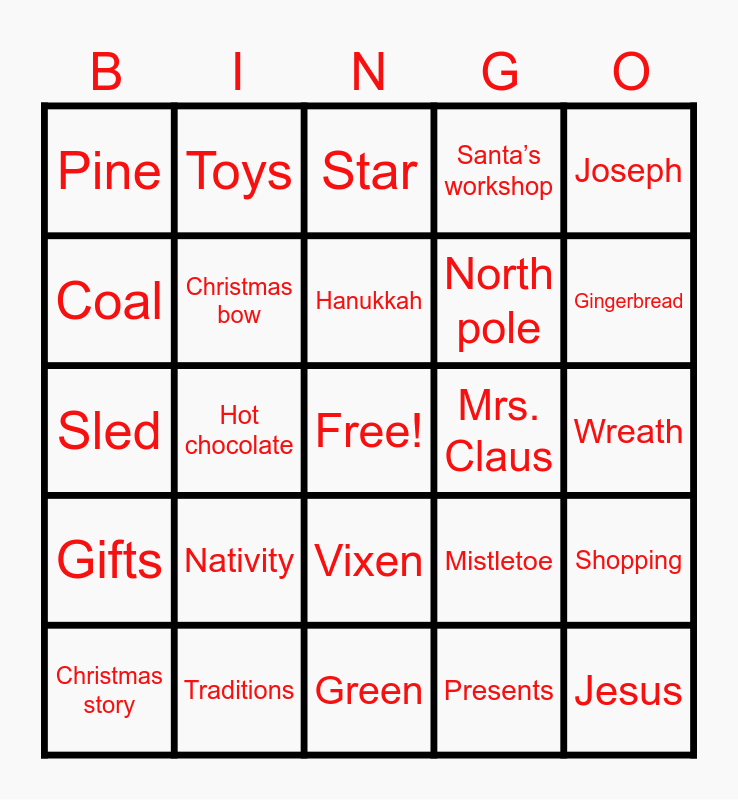 This bingo card has a free space and 75 words: Chimney, Angel, Star, Christmas tree, Bell, Stockings, Naughty, Nice, Eggnog, Santa, Snow, Blessing, Hanukkah, Coal, Jingle, Hot chocolate, Elf, Jesus, Mary, Joseph, Wiseman, Sled, Christmas bow, Toys, Santa’s workshop, Blitzen, Christmas Eve, December 25th, Ornaments, Reindeer, Rudolph, Candy canes, Holly, Mistletoe, Gingerbread, North pole, Christmas carols, Ugly sweater, Wreath, Presents, Christmas lights, Cookies, Nutcracker, Decorations, Garland, Grinch, Christmas story, Pine, Dasher, Dancer, Prancer, Vixen, Comet, Cupid, Donner, Yule log, Feliz Navidad, Ho ho ho, Frosty, Fruitcake, Nativity, Pinecone, Scrooge, Sleigh, Family, Mrs. Claus, Bethlehem, Poinsettia, Jingle bells, Shopping, Gifts, Traditions, Red, Green and Noel.