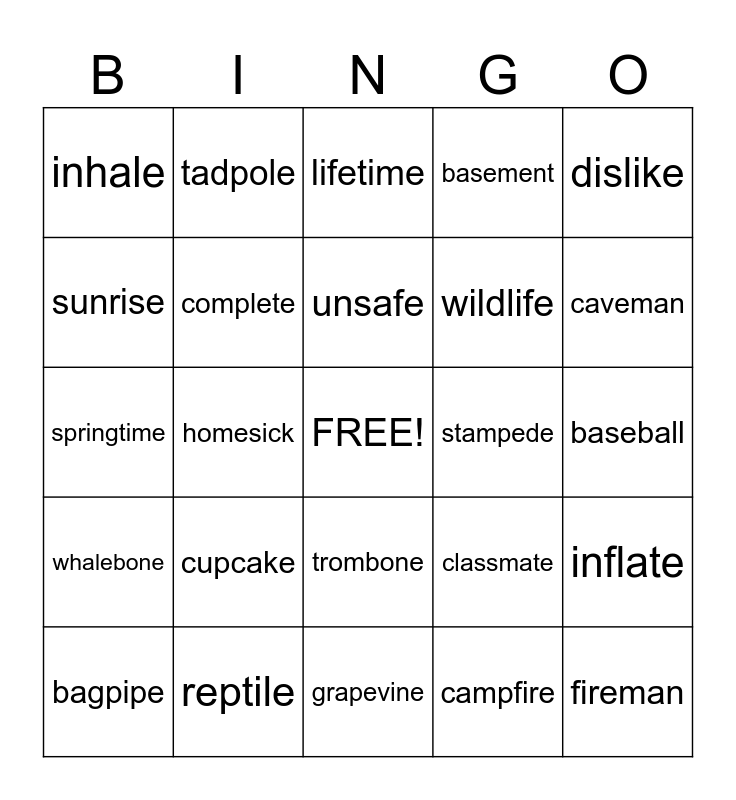 This bingo card has a free space and 24 words: cupcake, reptile, unsafe, bagpipe, dislike, inhale, sunrise, tadpole, stampede, trombone, wildlife, springtime, classmate, inflate, complete, campfire, baseball, lifetime, caveman, homesick, fireman, whalebone, basement and grapevine.