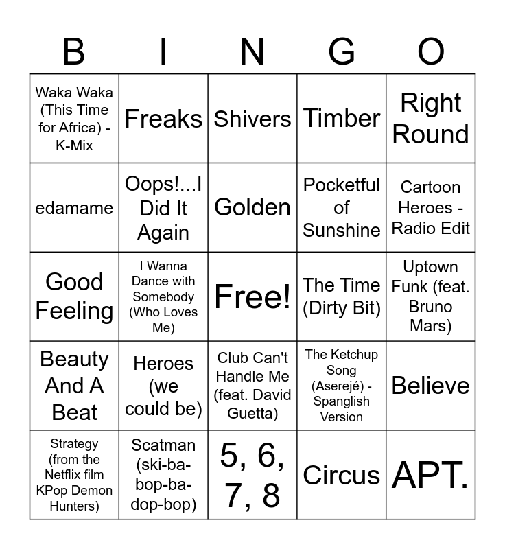 This bingo card has a free space and 74 words: Hey Ya!, Down, Shivers, Lady Marmalade, Shake It Off, I Don't Wanna Wait, Soda Pop, Big Girl (You Are Beautiful), Strategy (from the Netflix film KPop Demon Hunters), Wake Me Up, Livin' la Vida Loca, Fireball (feat. John Ryan), Golden, edamame, Cotton Eye Joe, I Wanna Dance with Somebody (Who Loves Me), Sapphire, Cartoon Heroes - Radio Edit, California Gurls, Good Feeling, Oops!...I Did It Again, Freaks, Timber, Dance with Me Tonight, APT., HOT TO GO!, Mamma Mia, Steve's Lava Chicken - Extended Version, Barbie Girl, Training Season, Right Round, I'm Outta Love - Radio Edit, Girls Just Want to Have Fun, Cheap Thrills, Kings & Queens, Circus, On The Floor - Radio Edit, Power, Time of Our Lives, Applause, 5, 6, 7, 8, Scatman (ski-ba-bop-ba-dop-bop), Houdini, My People, Worth It (feat. Kid Ink), Waka Waka (This Time for Africa) - K-Mix, Daddy Cool, Heroes (we could be), Just Dance, I Love It (feat. Charli XCX), Let's Get It Started - Spike Mix, Hips Don't Lie (feat. Wyclef Jean), Uptown Funk (feat. Bruno Mars), Can't Hold Us (feat. Ray Dalton), We Are Young (feat. Janelle Monáe), Whistle, Club Can't Handle Me (feat. David Guetta), Cheerleader (Felix Jaehn Remix) - Radio Edit, Rich Girl, Believe, Pocketful of Sunshine, What Is Love - 7" Mix, Beauty And A Beat, Alors on danse - Radio Edit, The Time (Dirty Bit), Stayin' Alive - From "Saturday Night Fever" Soundtrack, Shake Your Groove Thing, Thriller, The Ketchup Song (Aserejé) - Spanglish Version, Get Busy, Axel F, Murder On The Dancefloor, Sandstorm and Rock This Party (Everybody Dance Now).