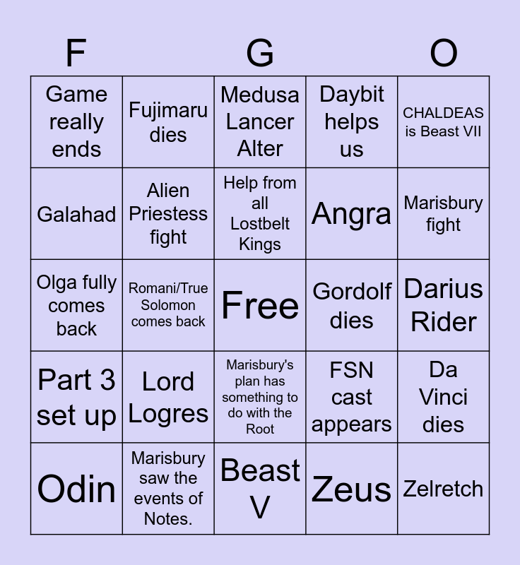 This bingo card has a free space and 24 words: Lord Logres, Marisbury saw the events of Notes., Help from all Lostbelt Kings, Odin, CHALDEAS is Beast VII, Game really ends, Galahad, Fujimaru dies, Gordolf dies, Marisbury's plan has something to do with the Root, Angra, Olga fully comes back, FSN cast appears, Da Vinci dies, Alien Priestess fight, Zeus, Darius Rider, Medusa Lancer Alter, Marisbury fight, Romani/True Solomon comes back, Zelretch, Part 3 set up, Daybit helps us and Beast V.
