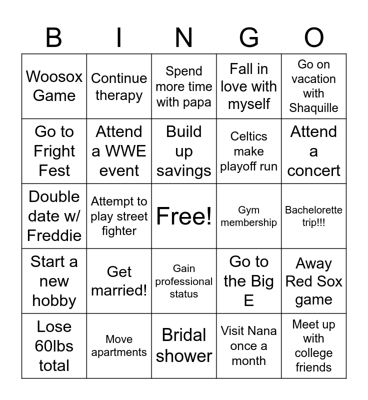 This bingo card has a free space and 24 words: Get married!, Move apartments, Build up savings, Lose 60lbs total, Go on vacation with Shaquille, Woosox Game, Go to Fright Fest, Continue therapy, Gym membership, Gain professional status, Celtics make playoff run, Double date w/ Freddie, Go to the Big E, Away Red Sox game, Attend a WWE event, Visit Nana once a month, Bachelorette trip!!!, Spend more time with papa, Attend a concert, Attempt to play street fighter, Meet up with college friends, Start a new hobby, Fall in love with myself and Bridal shower.