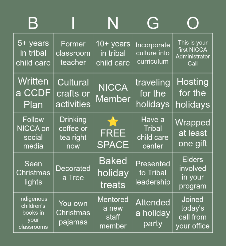 This bingo card has a free space and 24 words: Decorated a Tree, You own Christmas pajamas, NICCA Member, Indigenous children's books in your classrooms, This is your first NICCA Administrator Call, 5+ years in tribal child care, Written a CCDF Plan, Former classroom teacher, Have a Tribal child care center, Baked holiday treats, traveling for the holidays, Follow NICCA on social media, Presented to Tribal leadership, Elders involved in your program, Cultural crafts or activities, Attended a holiday party, Wrapped at least one gift, 10+ years in tribal child care, Hosting for the holidays, Drinking coffee or tea right now, Joined today's call from your office, Seen Christmas lights, Incorporate culture into curriculum and Mentored a new staff member.