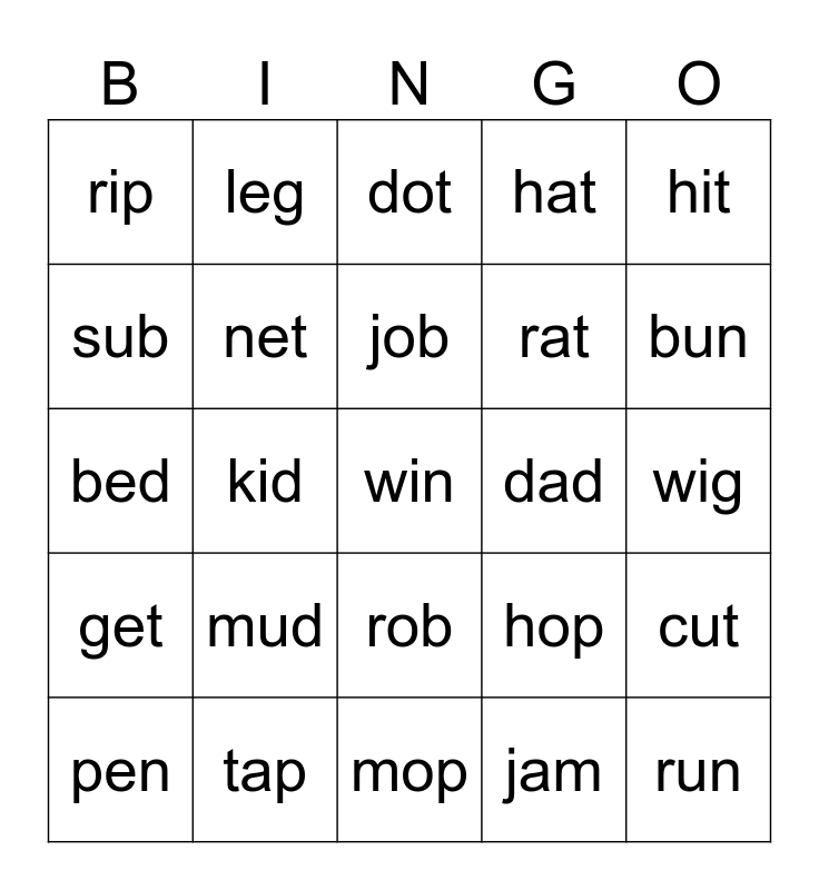 This bingo card has a free space and 24 words: mud, tap, job, pen, hit, rip, sub, leg, dad, rob, rat, bed, hop, cut, net, jam, wig, dot, bun, kid, run, get, hat and mop.