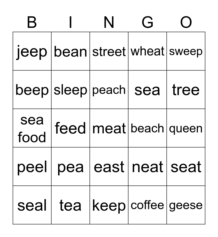 This bingo card has a free space and 24 words: pea, tea, peach, seal, sweep, jeep, beep, bean, beach, east, sea, sea food, neat, seat, sleep, coffee, queen, street, tree, feed, geese, peel, wheat and keep.