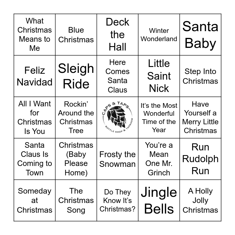 This bingo card has a free space and 40 words: Jingle Bell Rock, All I Want for Christmas Is You, Let It Snow!, Sleigh Ride, The Christmas Song, Frosty the Snowman, Here Comes Santa Claus, Last Christmas, Santa Baby, Santa Claus Is Coming to Town, Rockin’ Around the Christmas Tree, Winter Wonderland, A Holly Jolly Christmas, Have Yourself a Merry Little Christmas, It’s the Most Wonderful Time of the Year, Christmas (Baby Please Home), It’s Beginning to Look a Lot Like Christmas, What Christmas Means to Me, I Saw Mommy Kissing Santa Claus, Deck the Hall, Run Rudolph Run, Jingle Bells, Little Saint Nick, Feliz Navidad, Up On the House Top, Please Come Home for Christmas, Wonderful Christmastime, Happy Xmas (War Is Over), (There’s No Place Like) Home for the Holidays, White Christmas, Silver Bells, Someday at Christmas, Mele Kalikimaka, You’re a Mean One Mr. Grinch, Step Into Christmas, Do They Know It’s Christmas?, Grandma Got Run Over By a Reindeer, Merry Christmas Baby, Blue Christmas and Baby, It’s Cold Outside.