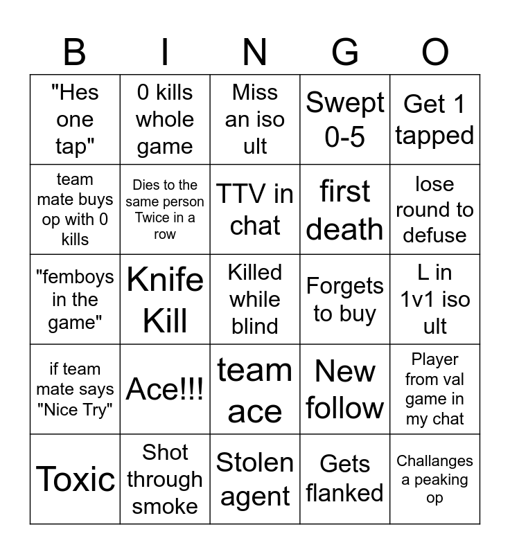 This bingo card has 25 words: Ace!!!, Stolen agent, TTV in chat, Toxic, Get 1 tapped, "Hes one tap", team mate buys op with 0 kills, 0 kills whole game, Forgets to buy, team ace, first death, "femboys in the game", New follow, Player from val game in my chat, Dies to the same person Twice in a row, Challanges a peaking op, L in 1v1 iso ult, Miss an iso ult, lose round to defuse, Knife Kill, Killed while blind, Shot through smoke, if team mate says "Nice Try", Swept 0-5 and Gets flanked.