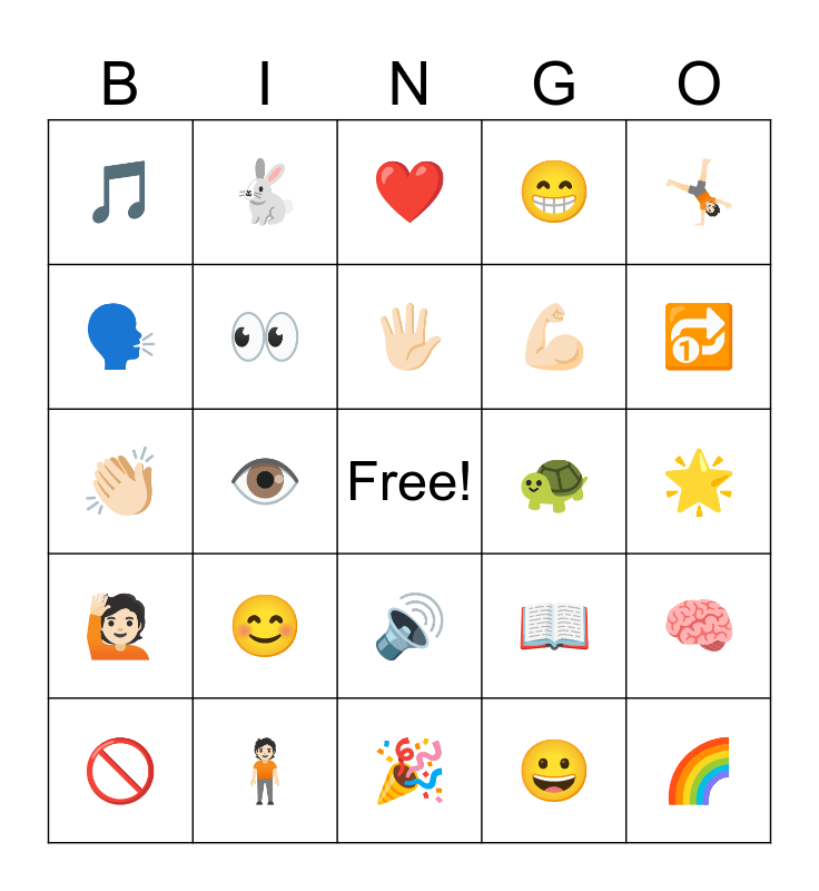 This bingo card has a free space and 24 words: π, π§π», ππ», π«, π€Έπ», π΅, π£οΈ, π, π’, π, πͺπ», ππ», π, π§ , π, π, π, β€οΈ, π, ποΈ, π, ππ», π and π.