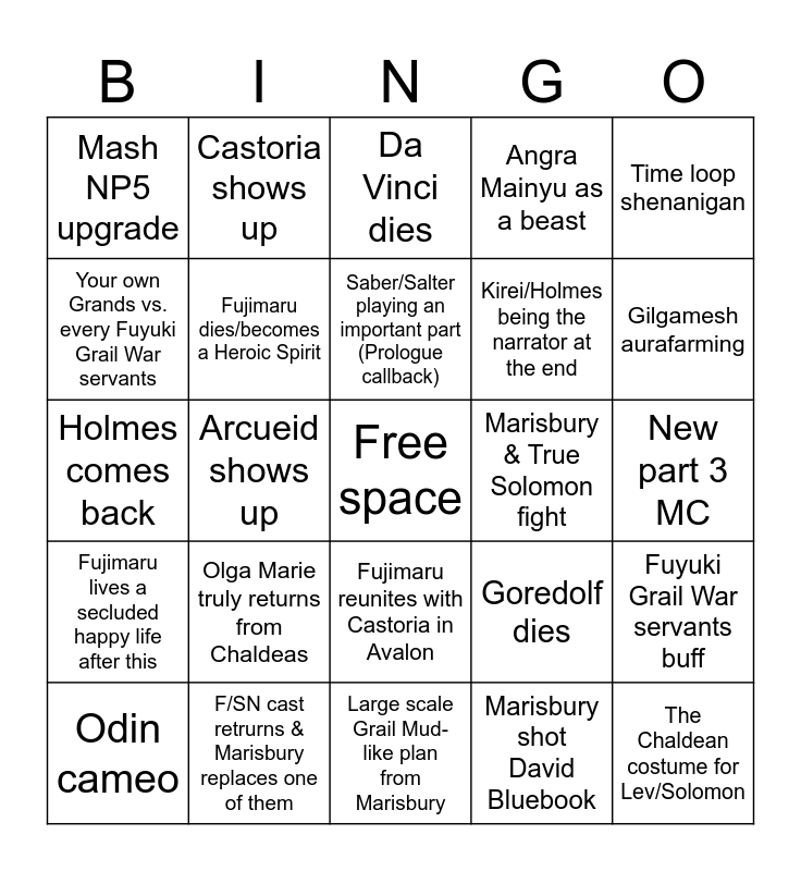 This bingo card has a free space and 24 words: Olga Marie truly returns from Chaldeas, F/SN cast retrurns & Marisbury replaces one of them, Saber/Salter playing an important part (Prologue callback), Odin cameo, Time loop shenanigan, Mash NP5 upgrade, Your own Grands vs. every Fuyuki Grail War servants, Castoria shows up, Marisbury & True Solomon fight, Fujimaru reunites with Castoria in Avalon, Kirei/Holmes being the narrator at the end, Holmes comes back, Goredolf dies, Fuyuki Grail War servants buff, Fujimaru dies/becomes a Heroic Spirit, Marisbury shot David Bluebook, New part 3 MC, Da Vinci dies, Gilgamesh aurafarming, Arcueid shows up, The Chaldean costume for Lev/Solomon, Fujimaru lives a secluded happy life after this, Angra Mainyu as a beast and Large scale Grail Mud-like plan from Marisbury.