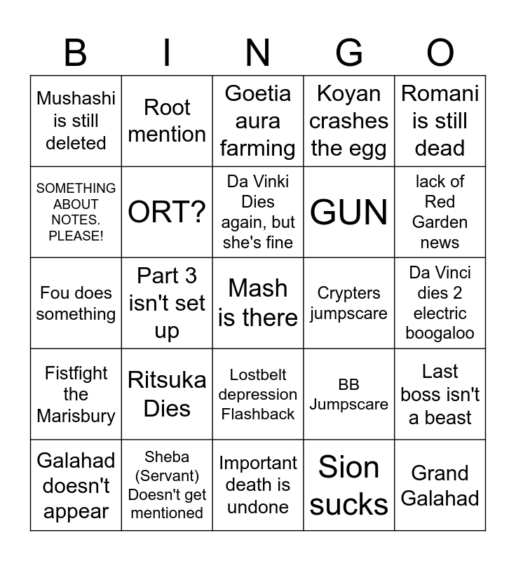 This bingo card has a free space and 24 words: Ritsuka Dies, Sheba (Servant) Doesn't get mentioned, Da Vinki Dies again, but she's fine, Galahad doesn't appear, Romani is still dead, Mushashi is still deleted, SOMETHING ABOUT NOTES. PLEASE!, Root mention, Crypters jumpscare, Lostbelt depression Flashback, GUN, Fou does something, BB Jumpscare, Last boss isn't a beast, ORT?, Sion sucks, Da Vinci dies 2 electric boogaloo, Goetia aura farming, lack of Red Garden news, Part 3 isn't set up, Grand Galahad, Fistfight the Marisbury, Koyan crashes the egg and Important death is undone.