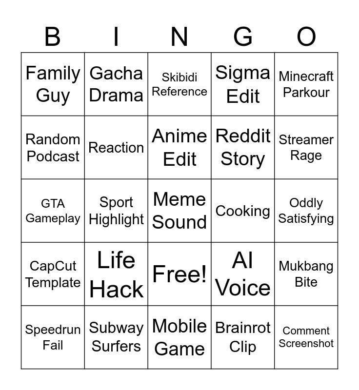 This bingo card has 26 words: Free!, Brainrot Clip, Anime Edit, Subway Surfers, Minecraft Parkour, Family Guy, Random Podcast, Gacha Drama, Oddly Satisfying, AI Voice, Reddit Story, GTA Gameplay, Mukbang Bite, Speedrun Fail, Sport Highlight, Basketball Dunk, Sigma Edit, CapCut Template, Skibidi Reference, Meme Sound, Streamer Rage, Mobile Game, Cooking, Life Hack, Reaction and Comment Screenshot.