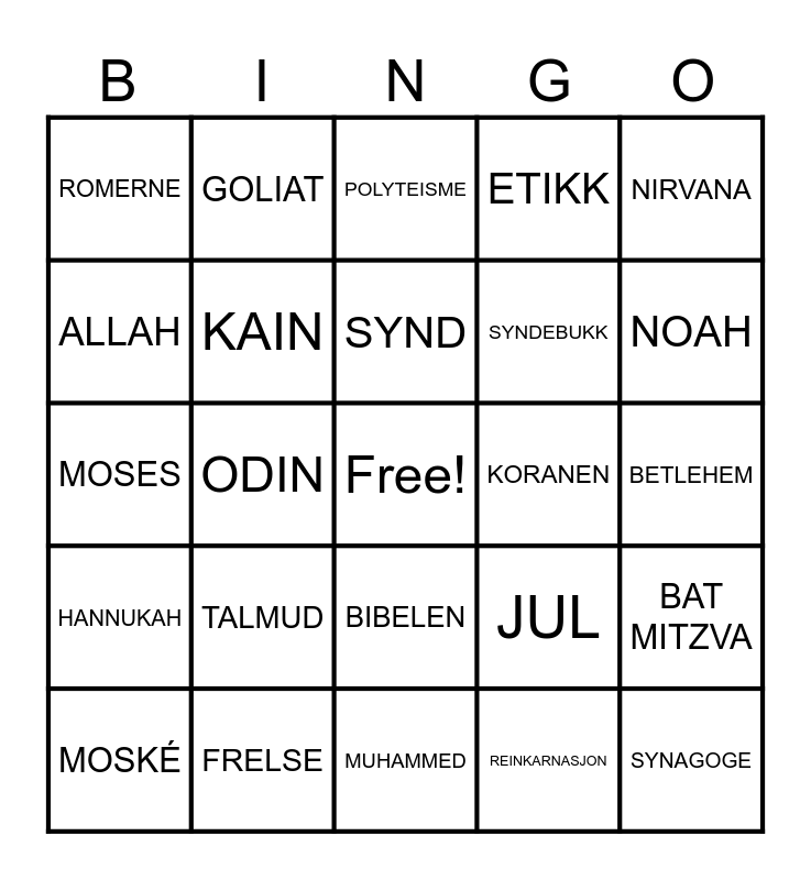 This bingo card has a free space and 43 words: MONOTEISME, SYNAGOGE, KIRKE, MOSKÉ, BUDDHA, REINKARNASJON, POLYTEISME, ATEISME, NIRVANA, FRELSE, ETIKK, KORANEN, BIBELEN, TALMUD, TANAKH, MUHAMMED, JESUS, MOSES, ADAM OG EVA, NOAH, GOLIAT, NINIVE, ASK OG EMBLA, ROMERNE, DÅP, BETLEHEM, VATIKANSTATEN, PAVE, JUL, HANNUKAH, BAR MITZVA, BAT MITZVA, TOR, ODIN, OLAV DEN HELLIGE, SHABBAT, KOSHER, SYND, ALLAH, SYNDEBUKK, GANESHA, KAIN and OLYMPUS.