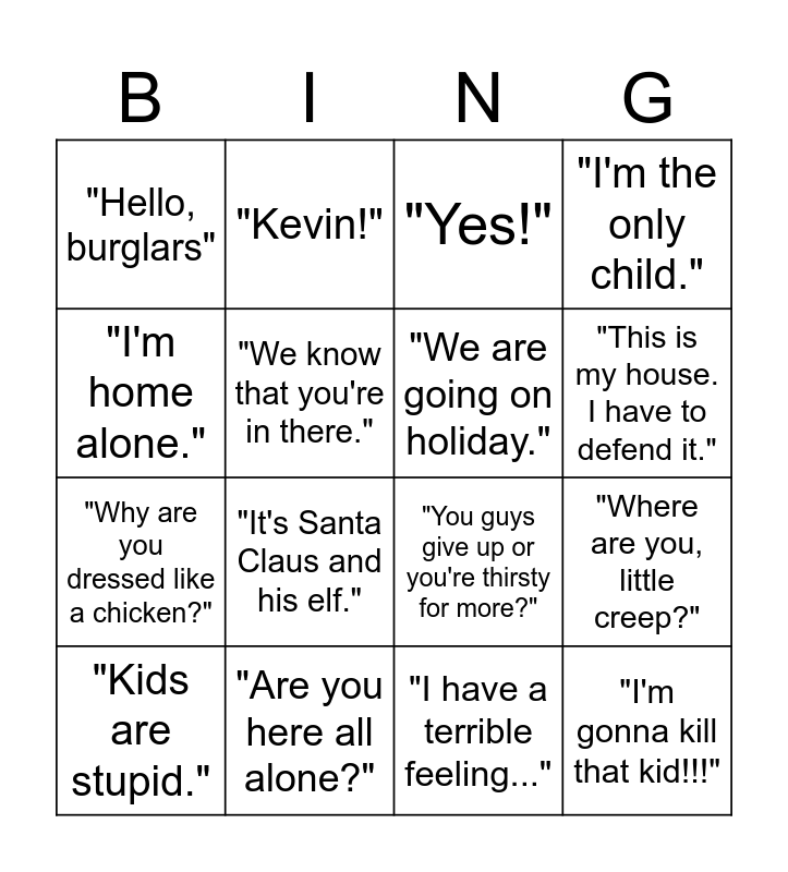 This bingo card has 16 words: "Are you here all alone?", "Where are you, little creep?", "Yes!", "Hello, burglars", "Why are you dressed like a chicken?", "Kevin!", "You guys give up or you're thirsty for more?", "I have a terrible feeling...", "I'm home alone.", "We know that you're in there.", "Kids are stupid.", "I'm the only child.", "It's Santa Claus and his elf.", "This is my house. I have to defend it.", "We are going on holiday." and "I'm gonna kill that kid!!!".